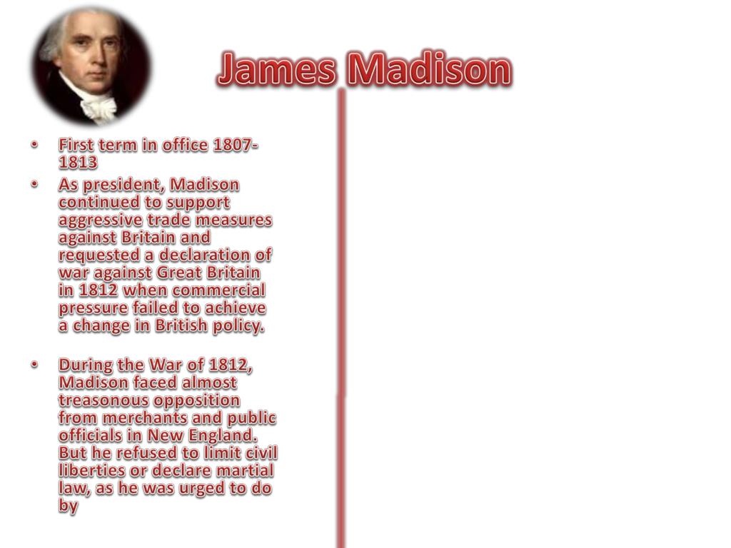 James Madison. First term in office 1807-1813 As president, Madison continued to support aggressive trade measures against Britain and requested a declaration of war against Great Britain in 1812 when commercial pressure failed to achieve a change in British policy.