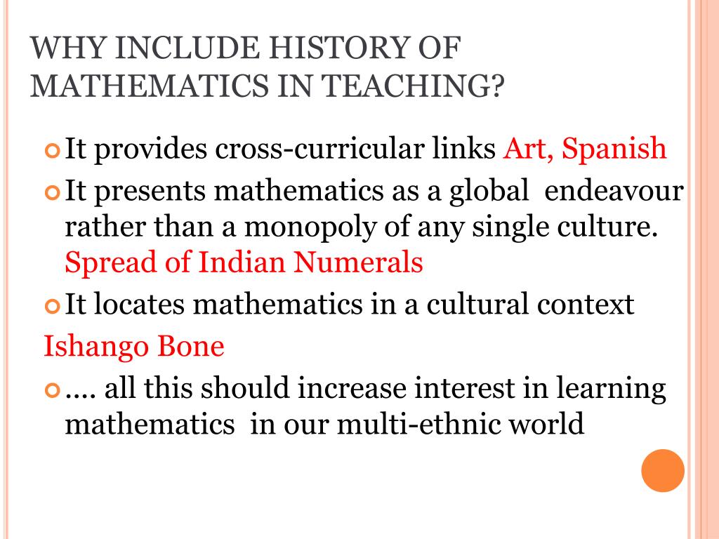 WHY INCLUDE HISTORY OF MATHEMATICS IN TEACHING? • It provides cross-curricular links Art, Spanish • It presents mathematics as a global endeavour rather than a monopoly of any single culture. Spread of Indian Numerals • It locates mathematics in a cultural context Ishango Bone • .... all this should increase interest in learning mathematics in our multi-ethnic world