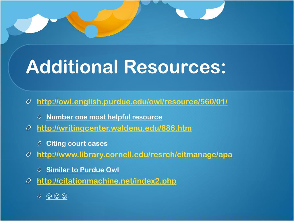 Additional Resources: • http://owl.english.purdue.edu/owl/resource/560/01/ • Number one most helpful resource • http://writingcenter.waldenu.edu/886.htm • Citing court cases • http://www.library.cornell.edu/resrch/citmanage/apa • Similar to Purdue Owl • http://citationmachine.net/index2.php •