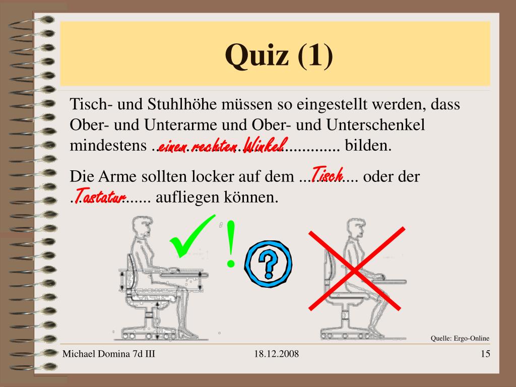 Tisch- und Stuhlhöhe müssen so eingestellt werden, dass Ober- und Unterarme und Ober- und Unterschenkel mindestens ............................................ bilden. Die Arme sollten locker auf dem .............. oder der ................... aufliegen können. Quelle: Ergo-Online Quiz (1) einen rechten Winkel Tisch Tastatur • ! 18.12.2008