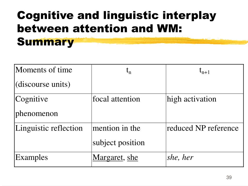 Cognitive and linguistic interplay between attention and WM • Attention feeds WM: What is attended at moment tn becomes activated in WM at moment tn+1 • Linguistic moments are discourse units • Focally attended referents (moment tn) are coded by subjects • Activated referents (moment tn+1) are coded by reduced NPs (pronouns)