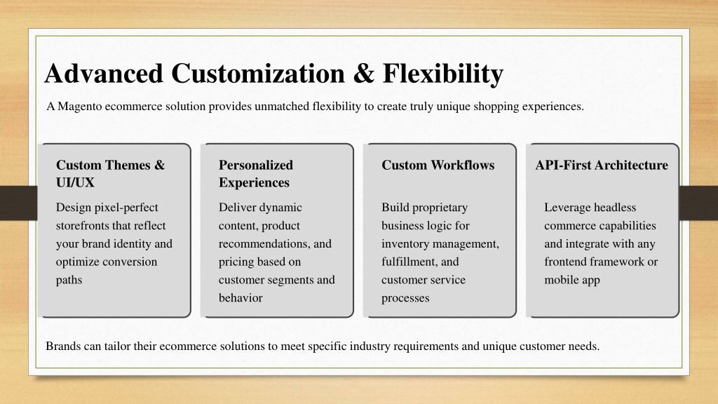 Advanced Customization & Flexibility A Magento ecommerce solution provides unmatched flexibility to create truly unique shopping experiences. Custom Themes & UI/UX Personalized Experiences Custom Workflows API-First Architecture Design pixel-perfect storefronts that reflect your brand identity and optimize conversion paths Deliver dynamic content, product recommendations, and pricing based on customer segments and behavior Build proprietary business logic for inventory management, fulfillment, and customer service processes Leverage headless commerce capabilities and integrate with any frontend framework or mobile app Brands can tailor their ecommerce solutions to meet specific industry requirements and unique customer needs.