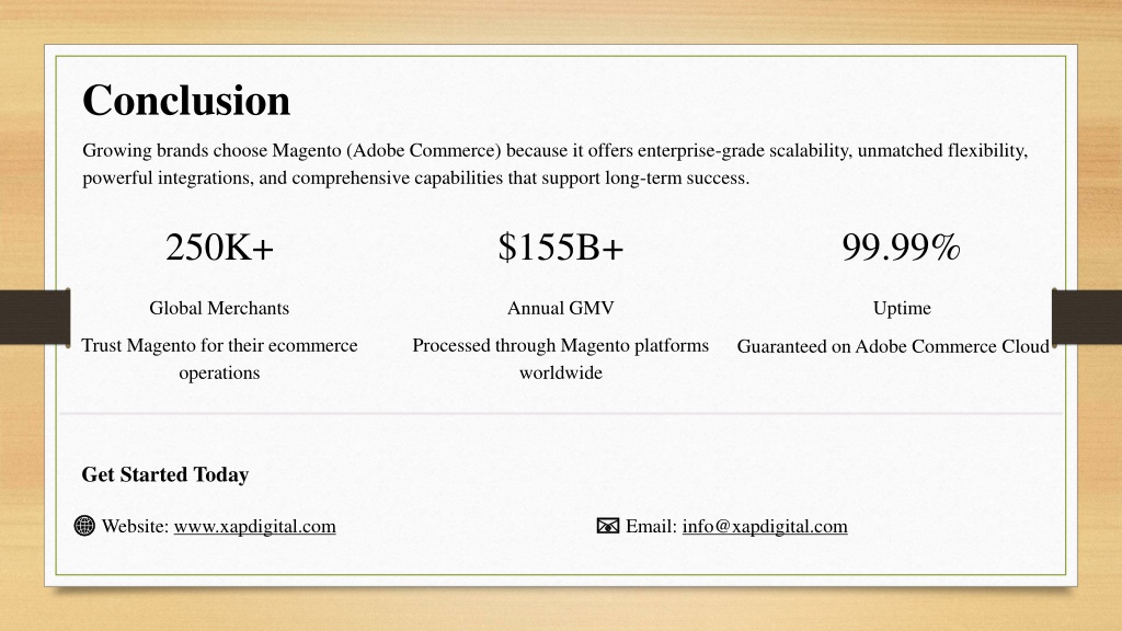 Conclusion Growing brands choose Magento (Adobe Commerce) because it offers enterprise-grade scalability, unmatched flexibility, powerful integrations, and comprehensive capabilities that support long-term success. 250K+ $155B+ 99.99% Global Merchants Annual GMV Uptime Trust Magento for their ecommerce operations Processed through Magento platforms worldwide Guaranteed on Adobe Commerce Cloud Get Started Today 🌐 Website:www.xapdigital.com 📧 Email: info@xapdigital.com
