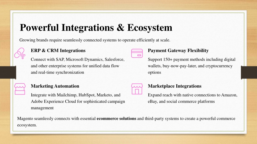 Powerful Integrations & Ecosystem Growing brands require seamlessly connected systems to operate efficiently at scale. ERP & CRM Integrations Payment Gateway Flexibility Connect with SAP, Microsoft Dynamics, Salesforce, and other enterprise systems for unified data flow and real-time synchronization Support 150+ payment methods including digital wallets, buy-now-pay-later, and cryptocurrency options Marketing Automation Marketplace Integrations Integrate with Mailchimp, HubSpot, Marketo, and Adobe Experience Cloud for sophisticated campaign management Expand reach with native connections to Amazon, eBay, and social commerce platforms Magento seamlessly connects with essential ecommerce solutions and third-party systems to create a powerful commerce ecosystem.