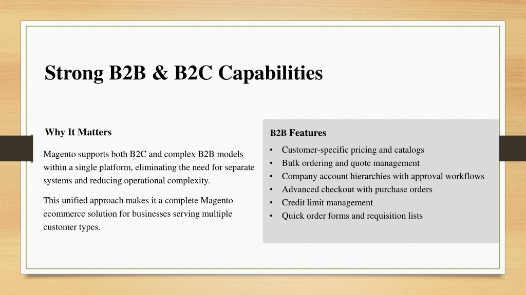 Strong B2B & B2C Capabilities Why It Matters B2B Features • Customer-specific pricing and catalogs • Bulk ordering and quote management • Company account hierarchies with approval workflows • Advanced checkout with purchase orders • Credit limit management • Quick order forms and requisition lists Magento supports both B2C and complex B2B models within a single platform, eliminating the need for separate systems and reducing operational complexity. This unified approach makes it a complete Magento ecommerce solution for businesses serving multiple customer types.