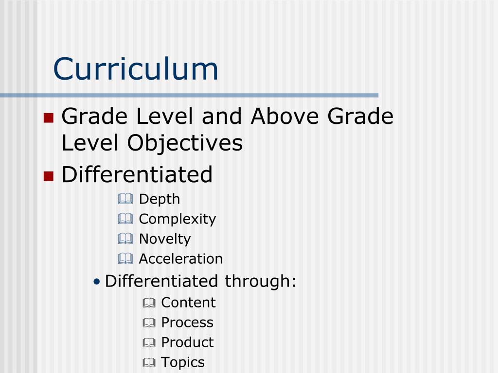 Curriculum • Grade Level and Above Grade Level Objectives • Differentiated • Depth • Complexity • Novelty • Acceleration • Differentiated through: • Content • Process • Product • Topics