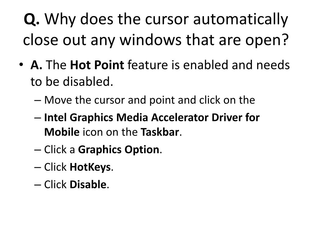 Q. Why does the cursor automatically close out any windows that are open? • A. The Hot Point feature is enabled and needs to be disabled. • Move the cursor and point and click on the • Intel Graphics Media Accelerator Driver for Mobile icon on the Taskbar. • Click a Graphics Option. • Click HotKeys. • Click Disable.