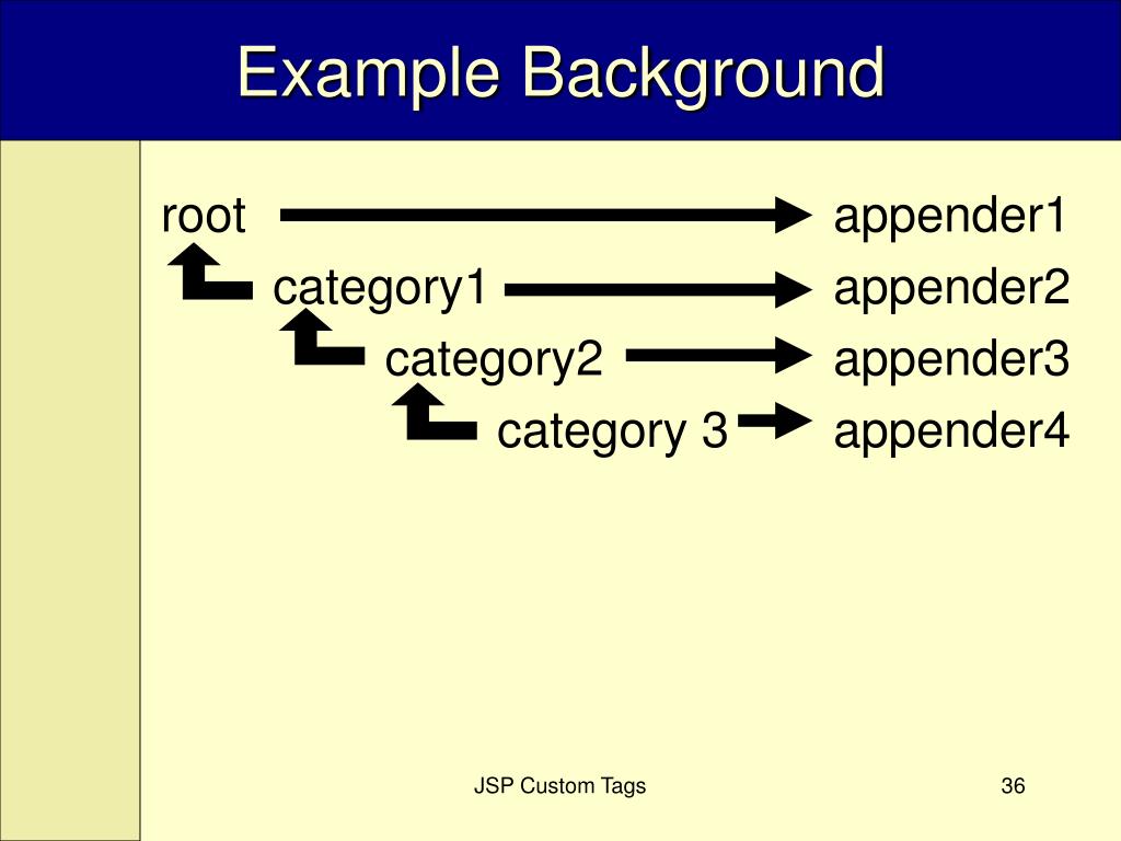 Example Background • root appender1 • category1 appender2 • category2 appender3 • category 3 appender4 JSP Custom Tags