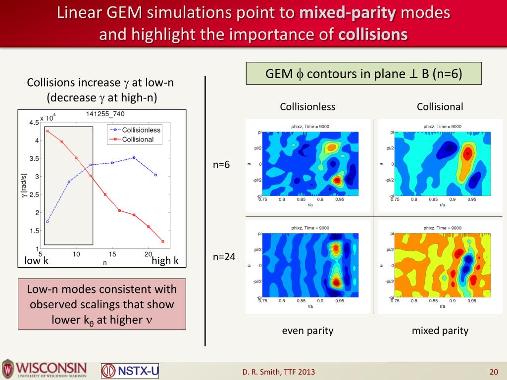 Linear GEM simulations point to mixed-parity modesand highlight the importance of collisions GEM f contours in plane ⊥ B (n=6) Collisions increase g at low-n(decrease g at high-n) Collisionless Collisional n=6 n=24 low k high k Low-n modes consistent with observed scalings that show lower kθ at higher n even parity mixed parity D. R. Smith, TTF 2013
