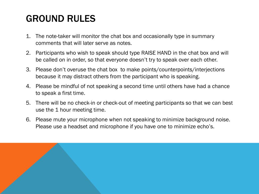 Ground rules • The note-taker will monitor the chat box and occasionally type in summary comments that will later serve as notes. • Participants who wish to speak should type RAISE HAND in the chat box and will be called on in order, so that everyone doesn’t try to speak over each other. • Please don’t overuse the chat box to make points/counterpoints/interjections because it may distract others from the participant who is speaking. • Please be mindful of not speaking a second time until others have had a chance to speak a first time. • There will be no check-in or check-out of meeting participants so that we can best use the 1 hour meeting time. • Please mute your microphone when not speaking to minimize background noise. Please use a headset and microphone if you have one to minimize echo’s.