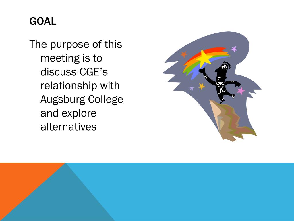 goal • The purpose of this meeting is to discuss CGE’s relationship with Augsburg College and explore alternatives