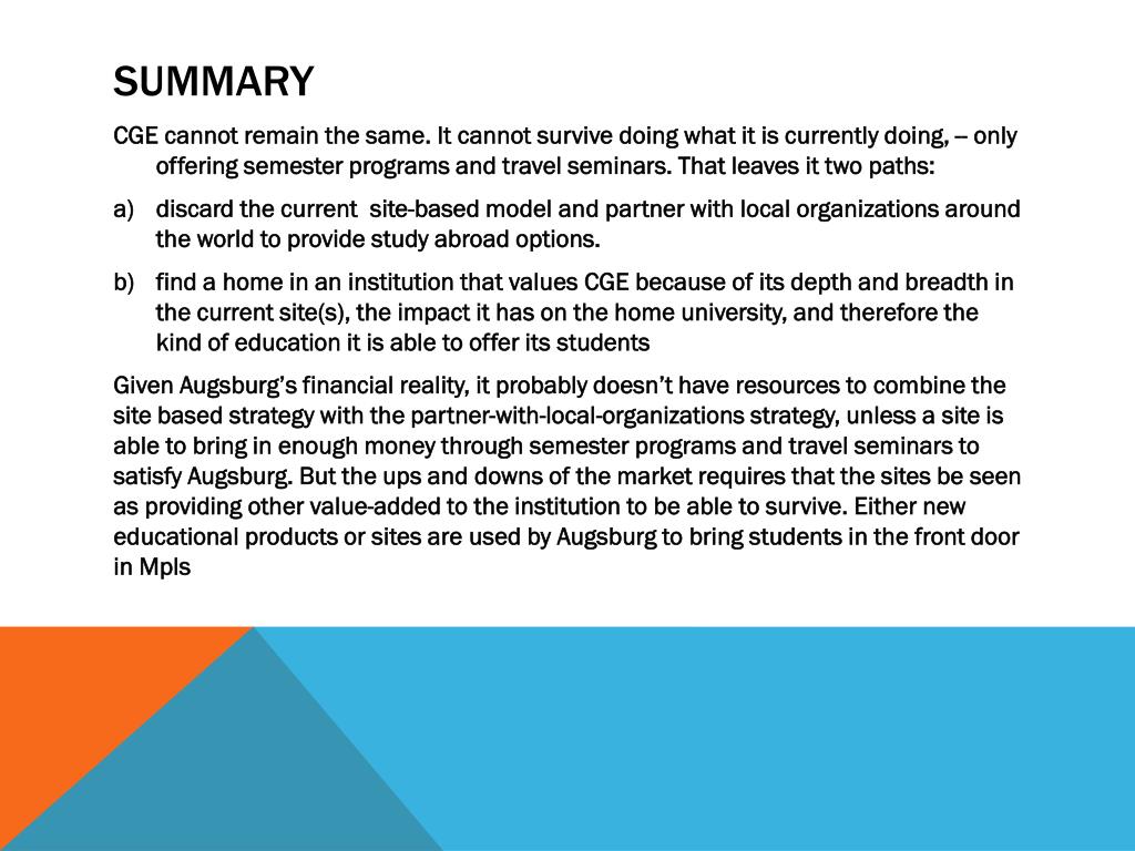 summary • CGE cannot remain the same. It cannot survive doing what it is currently doing, -- only offering semester programs and travel seminars. That leaves it two paths: • discard the current site-based model and partner with local organizations around the world to provide study abroad options. • find a home in an institution that values CGE because of its depth and breadth in the current site(s), the impact it has on the home university, and therefore the kind of education it is able to offer its students • Given Augsburg’s financial reality, it probably doesn’t have resources to combine the site based strategy with the partner-with-local-organizations strategy, unless a site is able to bring in enough money through semester programs and travel seminars to satisfy Augsburg. But the ups and downs of the market requires that the sites be seen as providing other value-added to the institution to be able to survive. Either new educational products or sites are used by Augsburg to bring students in the front door in Mpls