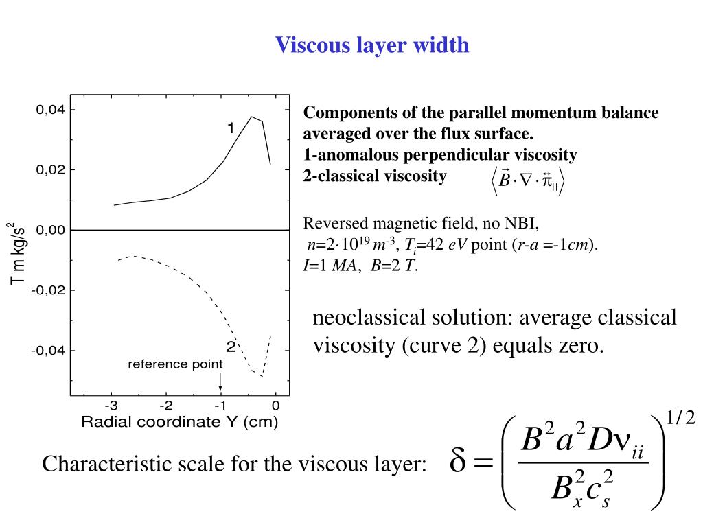 Viscous layer width Components of the parallel momentum balance averaged over the flux surface. 1-anomalous perpendicular viscosity 2-classical viscosity Reversed magnetic field, no NBI, n=2·1019 m-3, Ti=42 eV point (r-a =-1cm). I=1 MA, B=2 T. neoclassical solution: average classical viscosity (curve 2) equals zero. Characteristic scale for the viscous layer: