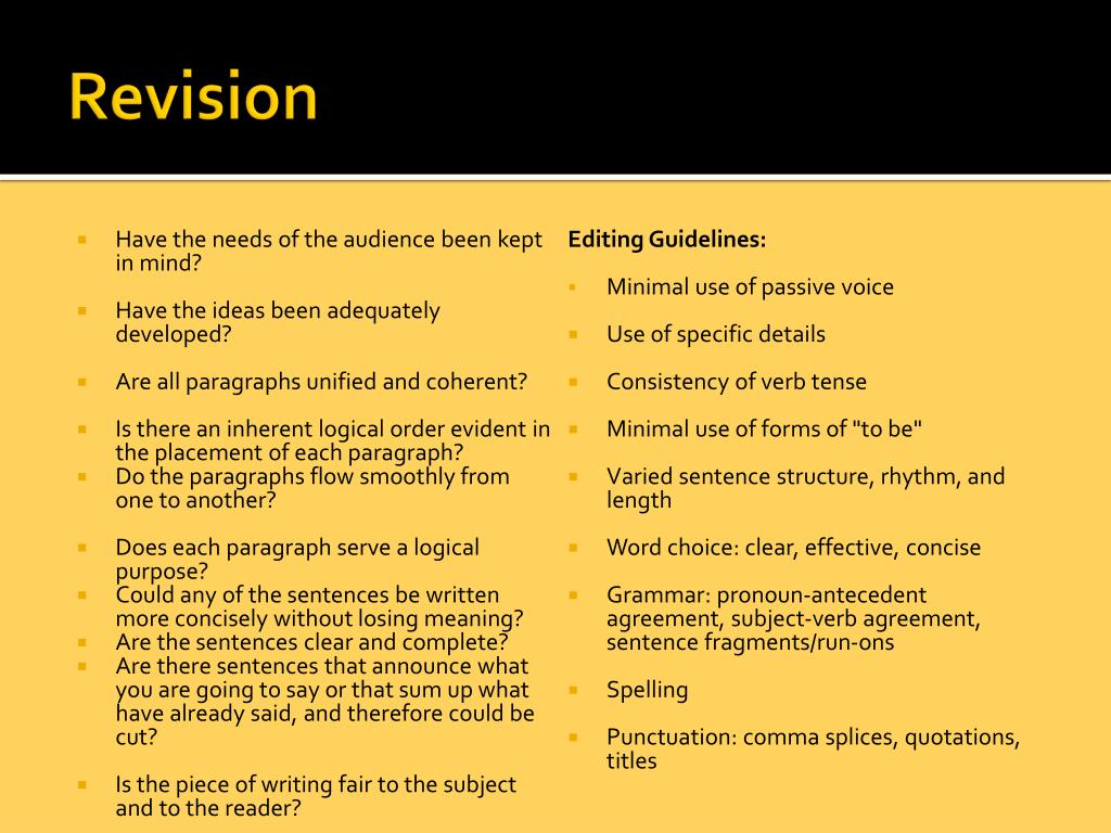 Revision • Have the needs of the audience been kept in mind? • Have the ideas been adequately developed? • Are all paragraphs unified and coherent? • Is there an inherent logical order evident in the placement of each paragraph? • Do the paragraphs flow smoothly from one to another? • Does each paragraph serve a logical purpose? • Could any of the sentences be written more concisely without losing meaning? • Are the sentences clear and complete? • Are there sentences that announce what you are going to say or that sum up what have already said, and therefore could be cut? • Is the piece of writing fair to the subject and to the reader? Editing Guidelines: • Minimal use of passive voice • Use of specific details • Consistency of verb tense • Minimal use of forms of "to be" • Varied sentence structure, rhythm, and length • Word choice: clear, effective, concise • Grammar: pronoun-antecedent agreement, subject-verb agreement, sentence fragments/run-ons • Spelling • Punctuation: comma splices, quotations, titles