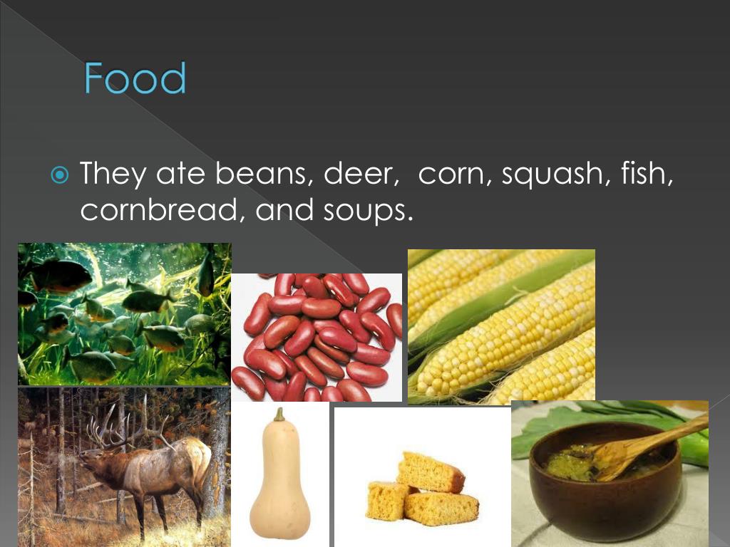 Food • They ate beans, deer, corn, squash, fish, cornbread, and soups.