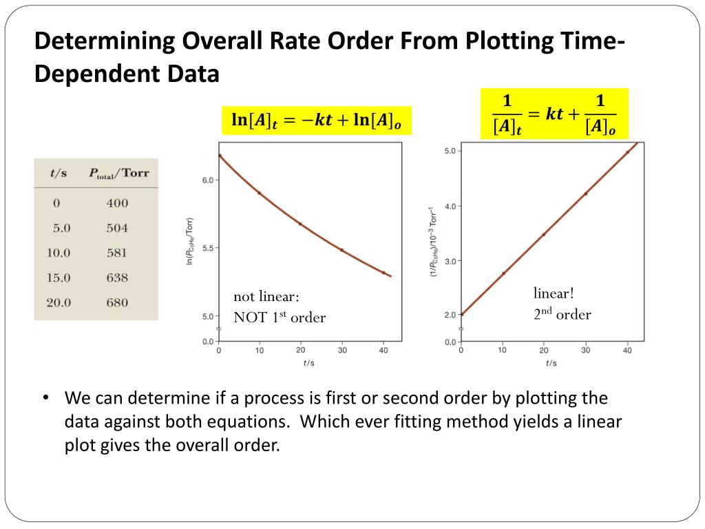 Determining Overall Rate Order From Plotting Time-Dependent Data linear! 2nd order not linear: NOT 1st order • We can determine if a process is first or second order by plotting the data against both equations. Which ever fitting method yields a linear plot gives the overall order.