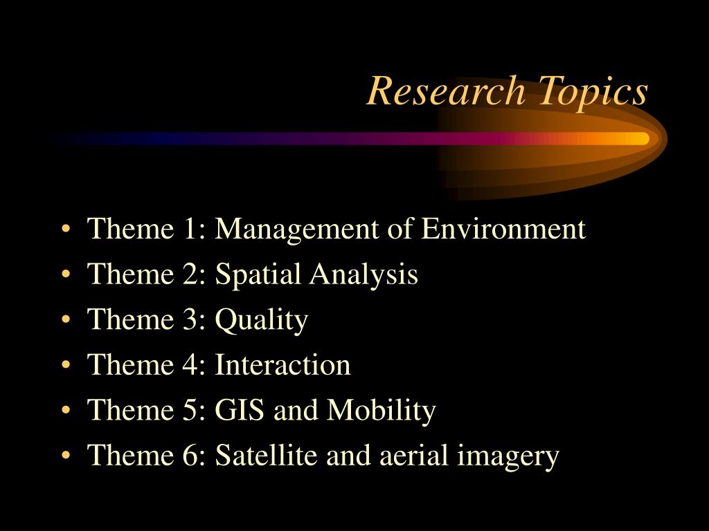 Research Topics • Theme 1: Management of Environment • Theme 2: Spatial Analysis • Theme 3: Quality • Theme 4: Interaction • Theme 5: GIS and Mobility • Theme 6: Satellite and aerial imagery