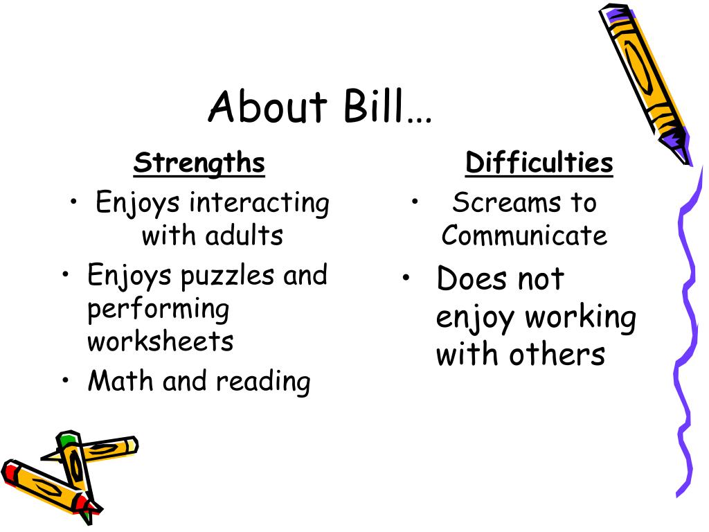 Strengths Enjoys interacting with adults Enjoys puzzles and performing worksheets Math and reading Difficulties Screams to Communicate Does not enjoy working with others About Bill…