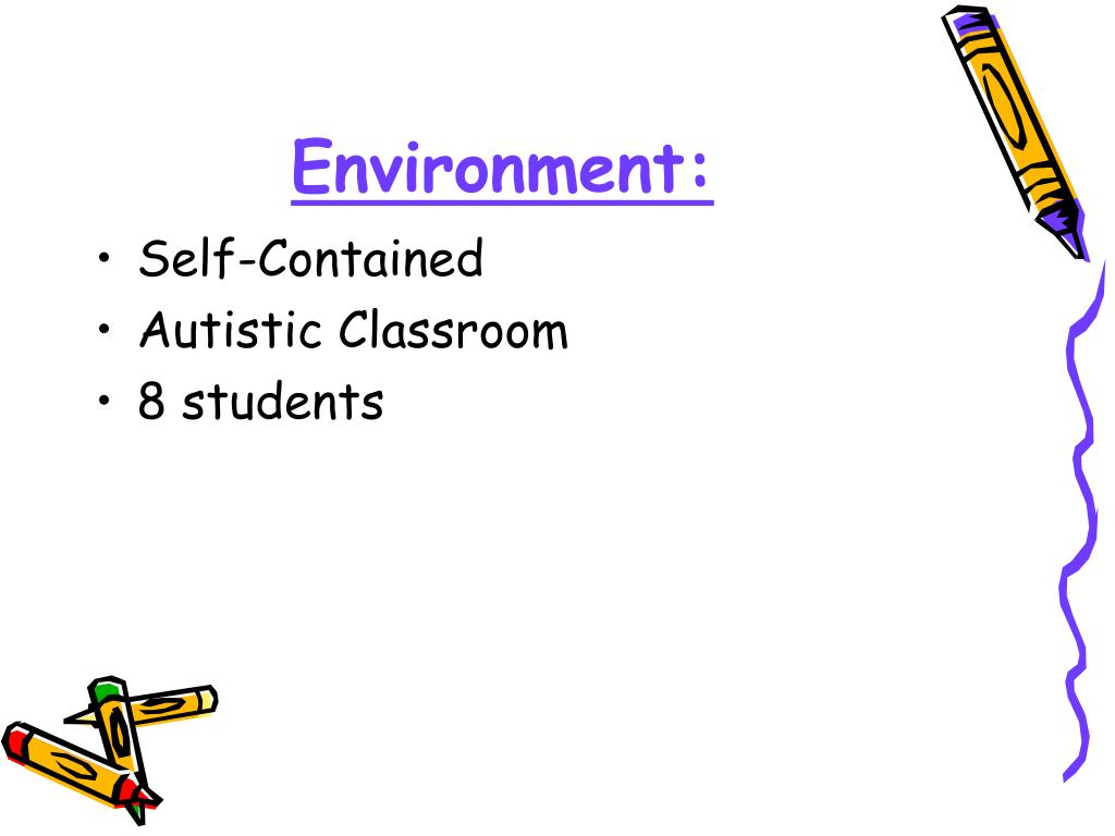 Environment: • Self-Contained • Autistic Classroom • 8 students