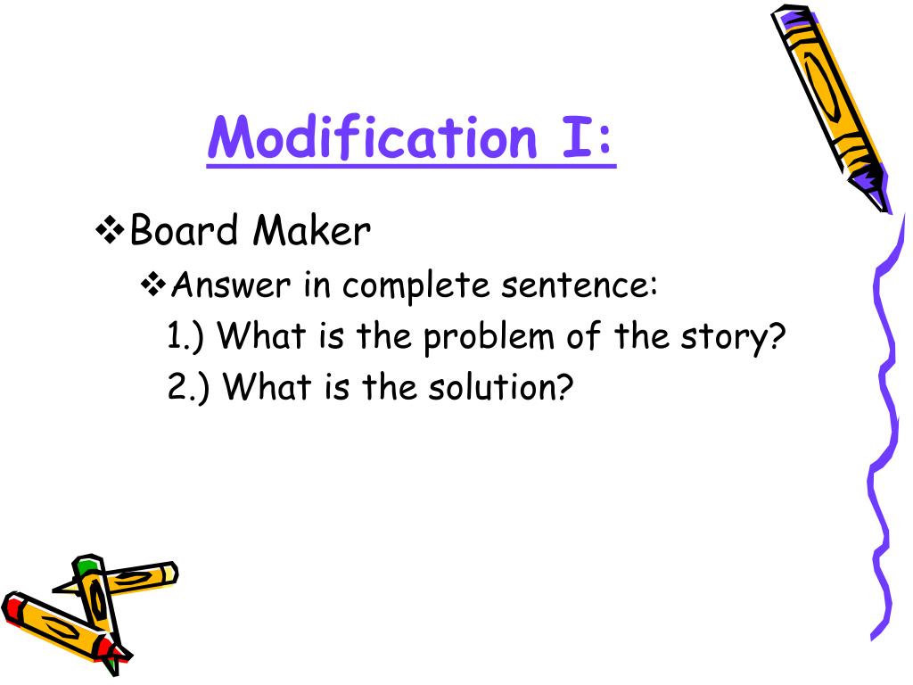 Modification I: • Board Maker • Answer in complete sentence: 1.) What is the problem of the story? 2.) What is the solution?