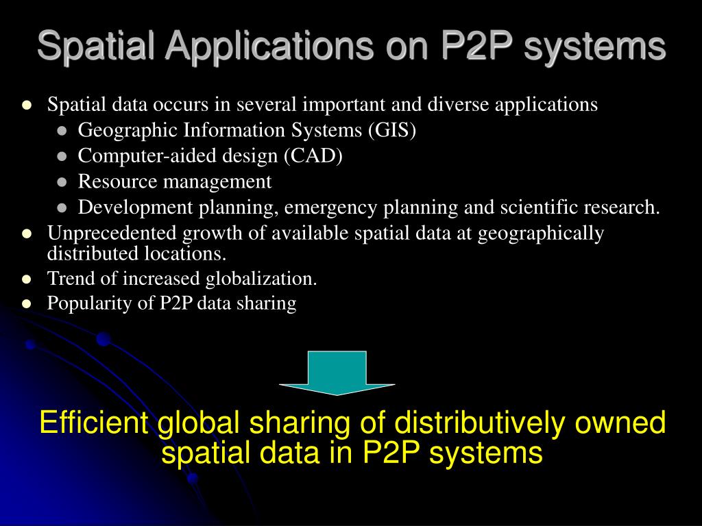 Spatial Applications on P2P systems • Spatial data occurs in several important and diverse applications • Geographic Information Systems (GIS) • Computer-aided design (CAD) • Resource management • Development planning, emergency planning and scientific research. • Unprecedented growth of available spatial data at geographically distributed locations. • Trend of increased globalization. • Popularity of P2P data sharing Efficient global sharing of distributively owned spatial data in P2P systems