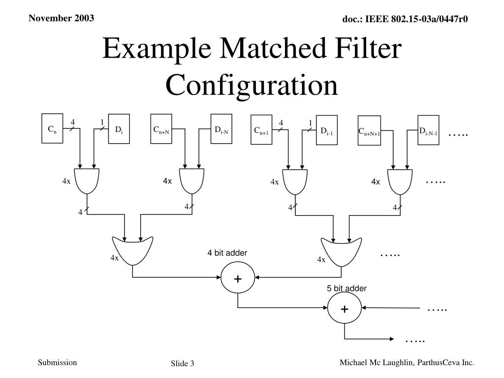 Example Matched Filter Configuration Cn 4 1 Di Cn+N Di-N Cn+1 4 1 Di-1 Di-N-1 Cn+N+1 ….. ….. 4x 4x 4x 4x 4 4 4 4 ….. 4 bit adder 4x 4x + 5 bit adder + ….. …..