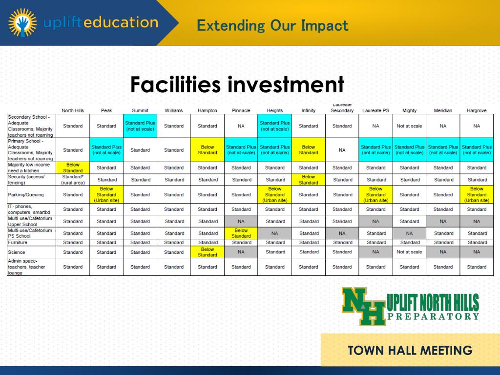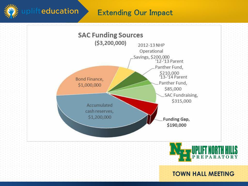 Facilities investment • Facilities are planned and built to support our academic programs • “Standards” exist for any Uplift school and we regularly assess how each school is doing relative to standards • Use bond funding to make sure every campus meets “standards”; philanthropy used for “extras” • Recent Uplift investments in NHP • $2.9 M for Science Classroom Building • $3.2 M for SAC TOWN HALL MEETING