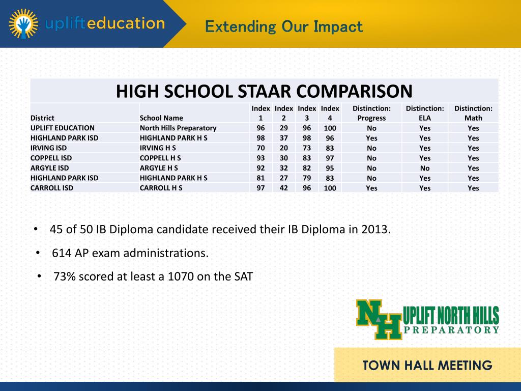 45 of 50 IB Diploma candidate received their IB Diploma in 2013. • 614 AP exam administrations. • 73% scored at least a 1070 on the SAT TOWN HALL MEETING