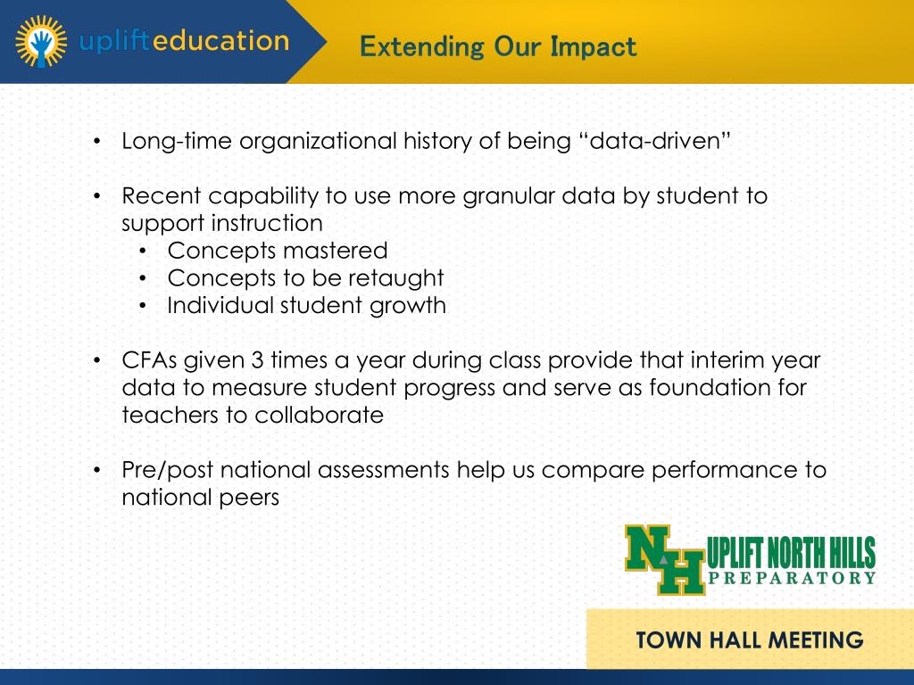 Long-time organizational history of being “data-driven” • Recent capability to use more granular data by student to support instruction • Concepts mastered • Concepts to be retaught • Individual student growth • CFAs given 3 times a year during class provide that interim year data to measure student progress and serve as foundation for teachers to collaborate • Pre/post national assessments help us compare performance to national peers TOWN HALL MEETING