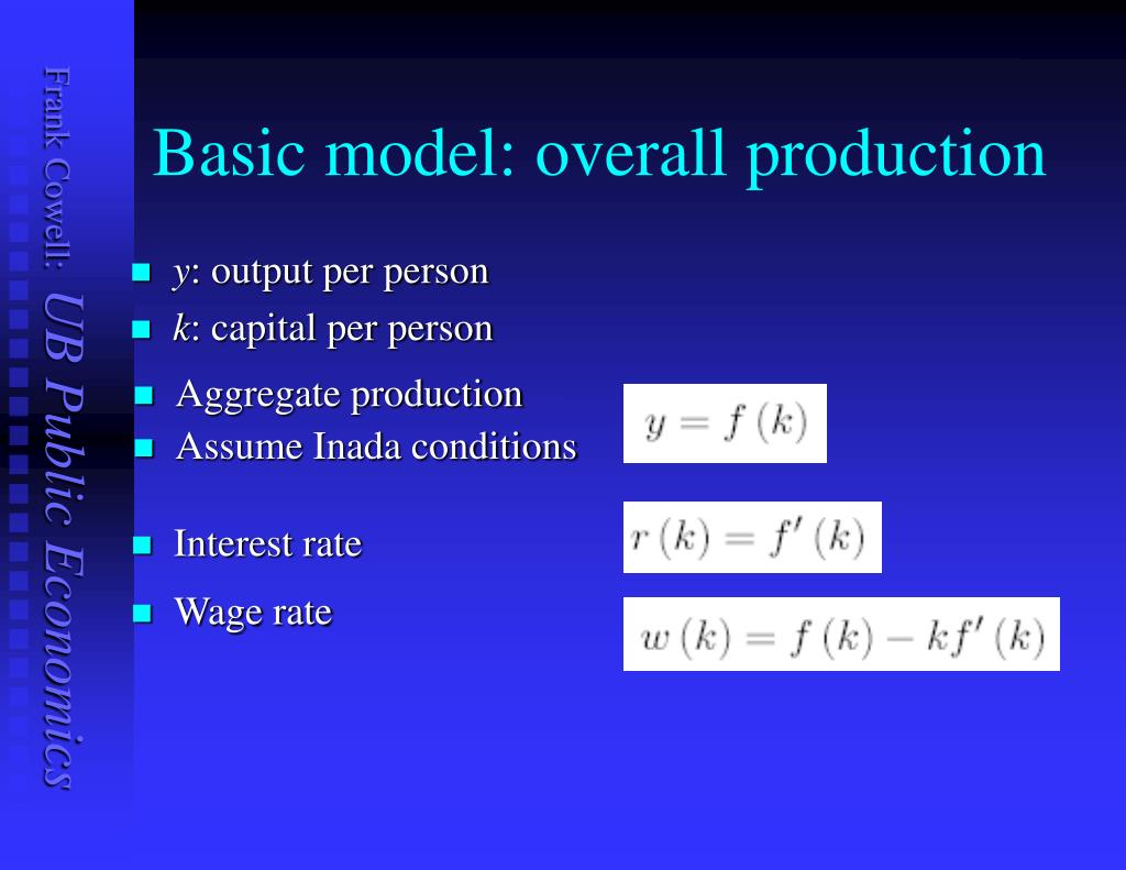 Basic model: overall production • y: output per person • k: capital per person • Aggregate production • Assume Inada conditions • Interest rate • Wage rate