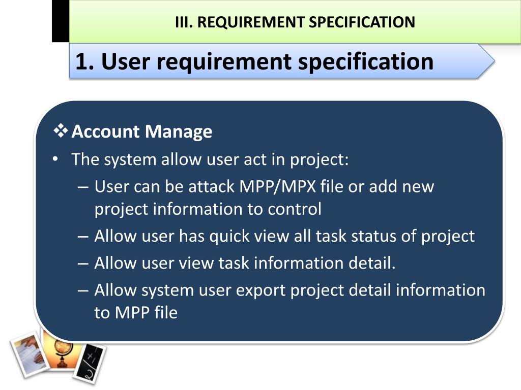 III. REQUIREMENT SPECIFICATION 1. User requirement specification • Account Manage • The system allow user act in project: • User can be attack MPP/MPX file or add new project information to control • Allow user has quick view all task status of project • Allow user view task information detail. • Allow system user export project detail information to MPP file