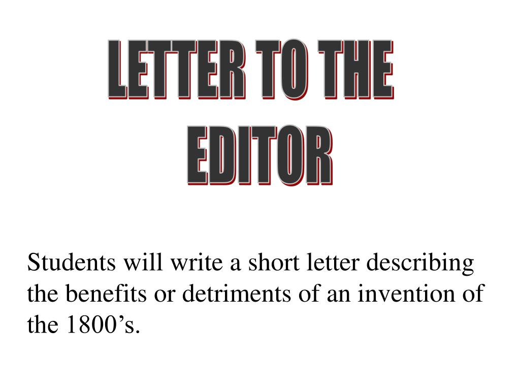 LETTER TO THE EDITOR Students will write a short letter describing the benefits or detriments of an invention of the 1800’s.