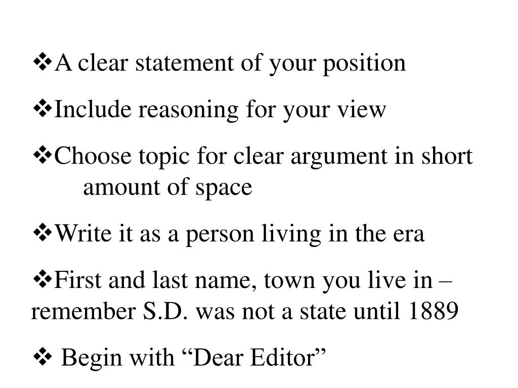 A clear statement of your position • Include reasoning for your view • Choose topic for clear argument in short amount of space • Write it as a person living in the era • First and last name, town you live in – remember S.D. was not a state until 1889 • Begin with “Dear Editor”