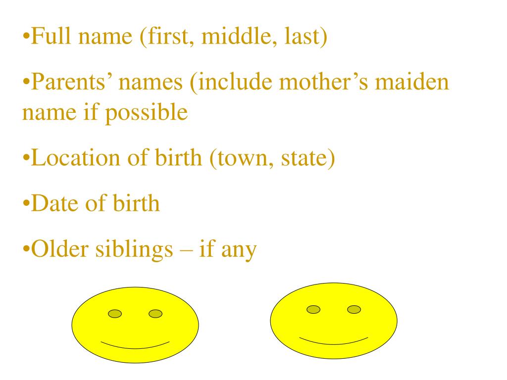 Full name (first, middle, last) • Parents’ names (include mother’s maiden name if possible • Location of birth (town, state) • Date of birth • Older siblings – if any