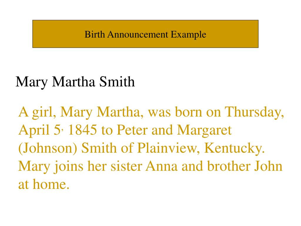 Birth Announcement Example Mary Martha Smith A girl, Mary Martha, was born on Thursday, April 5, 1845 to Peter and Margaret (Johnson) Smith of Plainview, Kentucky. Mary joins her sister Anna and brother John at home.