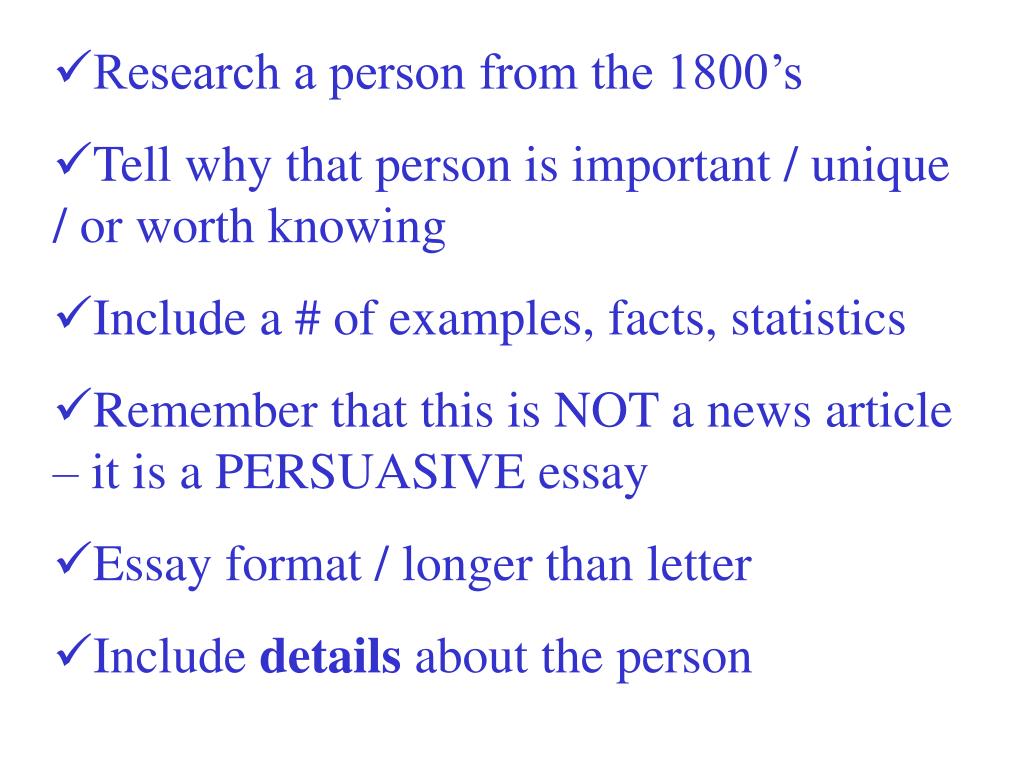 Research a person from the 1800’s • Tell why that person is important / unique / or worth knowing • Include a # of examples, facts, statistics • Remember that this is NOT a news article – it is a PERSUASIVE essay • Essay format / longer than letter • Include details about the person