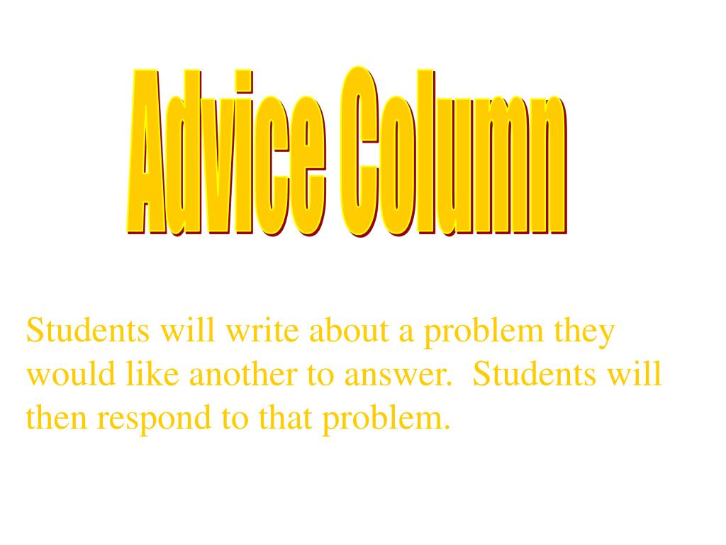 Advice Column Students will write about a problem they would like another to answer. Students will then respond to that problem.