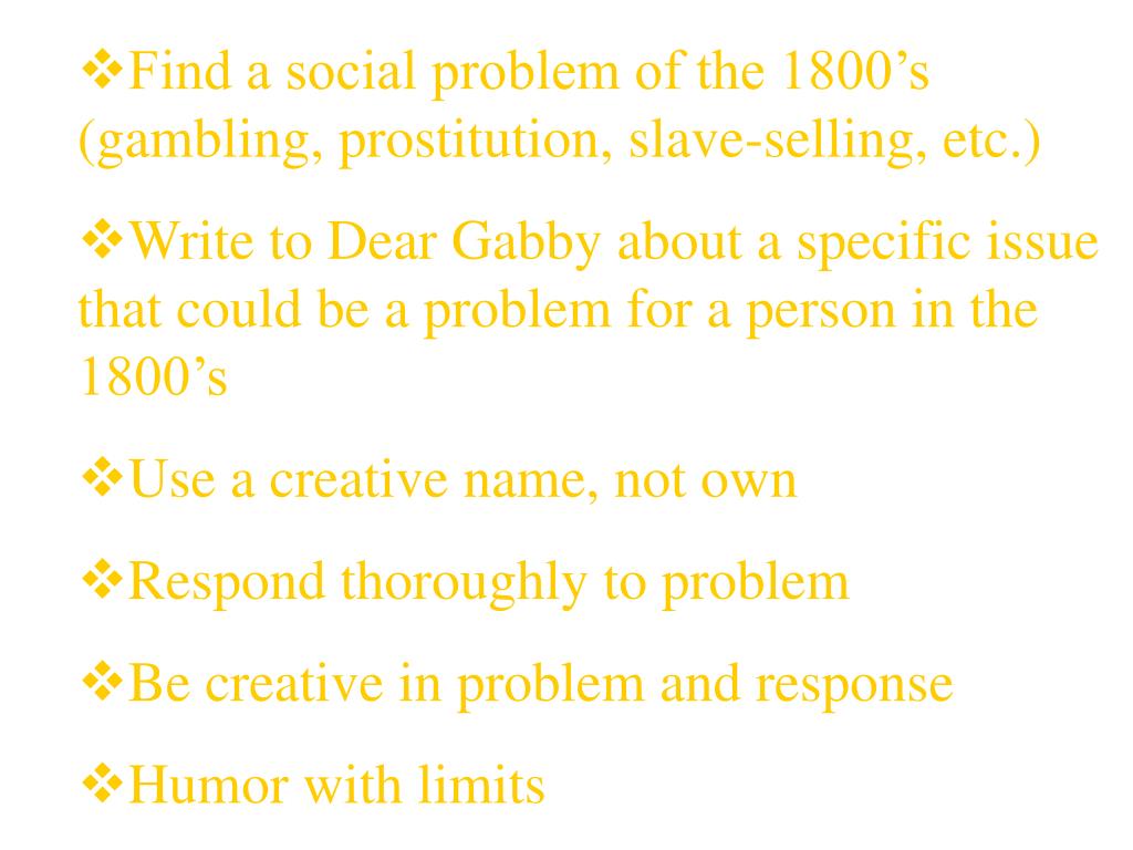 Find a social problem of the 1800’s (gambling, prostitution, slave-selling, etc.) • Write to Dear Gabby about a specific issue that could be a problem for a person in the 1800’s • Use a creative name, not own • Respond thoroughly to problem • Be creative in problem and response • Humor with limits