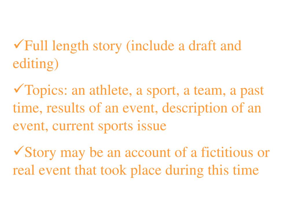 Full length story (include a draft and editing) • Topics: an athlete, a sport, a team, a past time, results of an event, description of an event, current sports issue • Story may be an account of a fictitious or real event that took place during this time