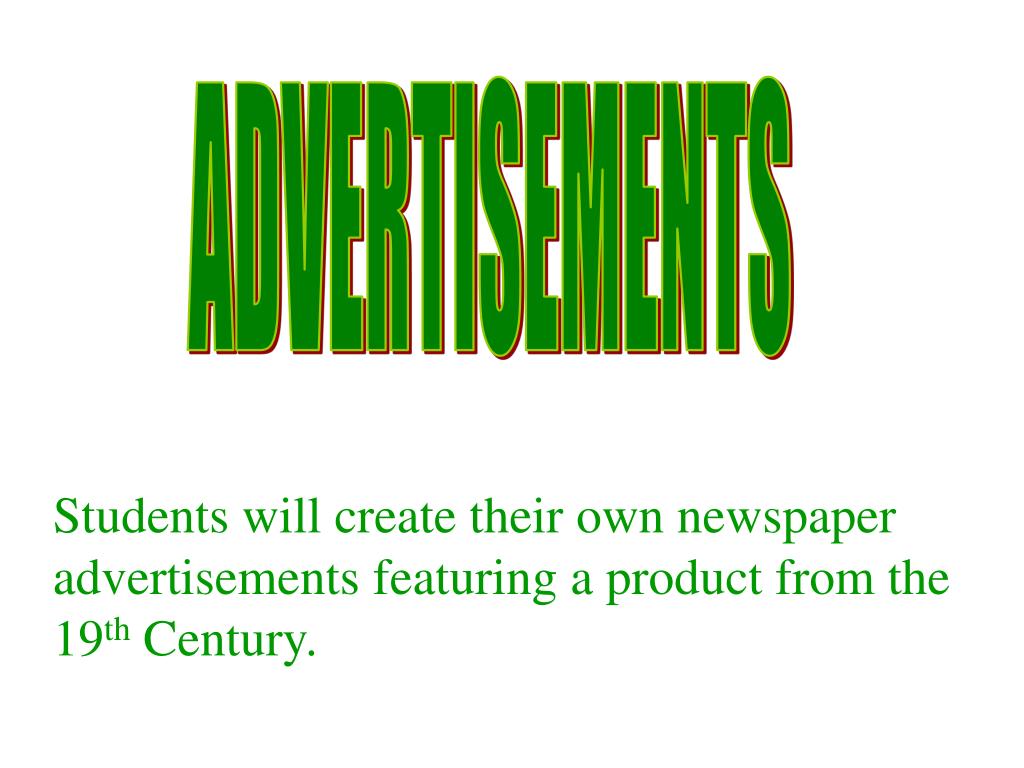 ADVERTISEMENTS Students will create their own newspaper advertisements featuring a product from the 19th Century.