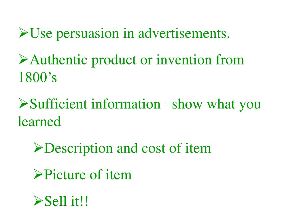 Use persuasion in advertisements. • Authentic product or invention from 1800’s • Sufficient information –show what you learned • Description and cost of item • Picture of item • Sell it!!
