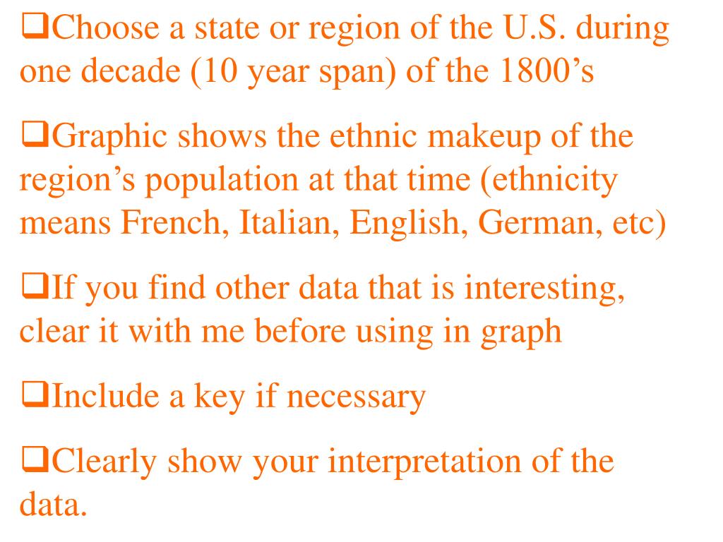 Choose a state or region of the U.S. during one decade (10 year span) of the 1800’s • Graphic shows the ethnic makeup of the region’s population at that time (ethnicity means French, Italian, English, German, etc) • If you find other data that is interesting, clear it with me before using in graph • Include a key if necessary • Clearly show your interpretation of the data.