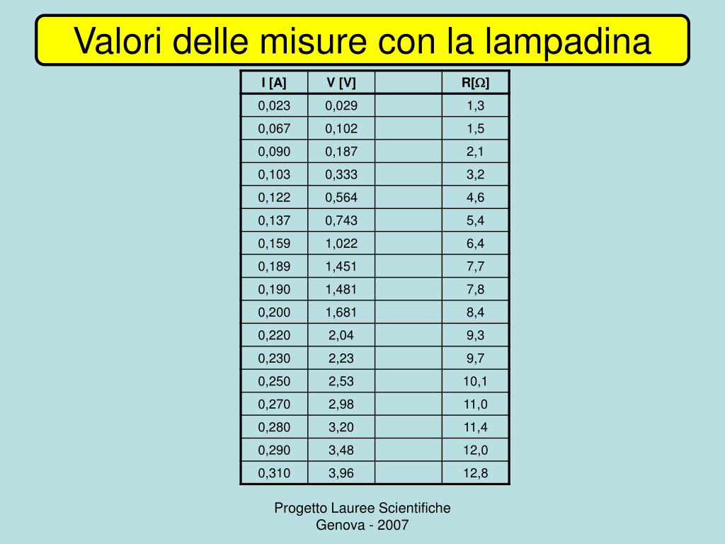 Valori delle misure con la lampadina Progetto Lauree Scientifiche Genova - 2007