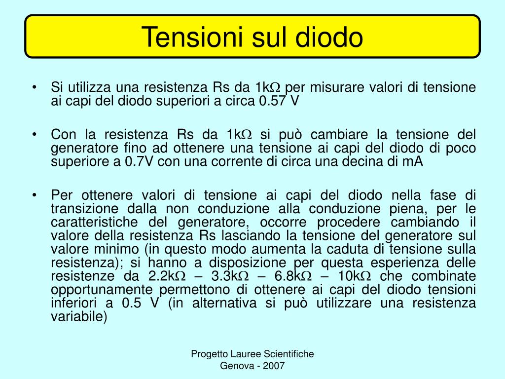 Tensioni sul diodo • Si utilizza una resistenza Rs da 1k per misurare valori di tensione ai capi del diodo superiori a circa 0.57 V • Con la resistenza Rs da 1k si può cambiare la tensione del generatore fino ad ottenere una tensione ai capi del diodo di poco superiore a 0.7V con una corrente di circa una decina di mA • Per ottenere valori di tensione ai capi del diodo nella fase di transizione dalla non conduzione alla conduzione piena, per le caratteristiche del generatore, occorre procedere cambiando il valore della resistenza Rs lasciando la tensione del generatore sul valore minimo (in questo modo aumenta la caduta di tensione sulla resistenza); si hanno a disposizione per questa esperienza delle resistenze da 2.2k – 3.3k – 6.8k – 10k che combinate opportunamente permettono di ottenere ai capi del diodo tensioni inferiori a 0.5 V (in alternativa si può utilizzare una resistenza variabile) Progetto Lauree Scientifiche Genova - 2007