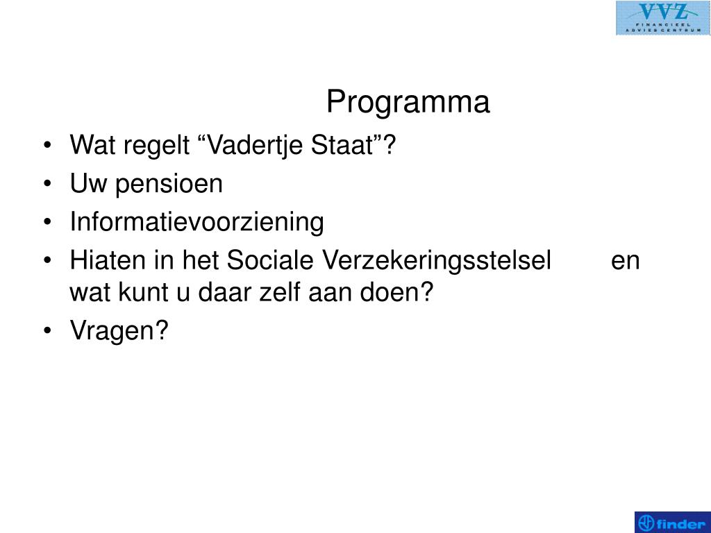 De Pensioenregeling van. Finder Relais Nederland B.V. Nico van der Zee VVZ Financieel Advies Centrum. Programma. Wat regelt “Vadertje Staat”? Uw pensioen Informatievoorziening Hiaten in het Sociale Verzekeringsstelsel en wat kunt u daar zelf aan doen? Vragen?.