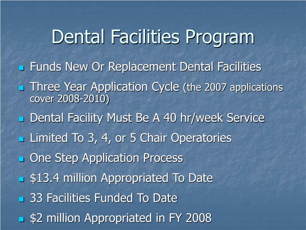 Dental Facilities Program • Funds New Or Replacement Dental Facilities • Three Year Application Cycle (the 2007 applications cover 2008-2010) • Dental Facility Must Be A 40 hr/week Service • Limited To 3, 4, or 5 Chair Operatories • One Step Application Process • $13.4 million Appropriated To Date • 33 Facilities Funded To Date • $2 million Appropriated in FY 2008
