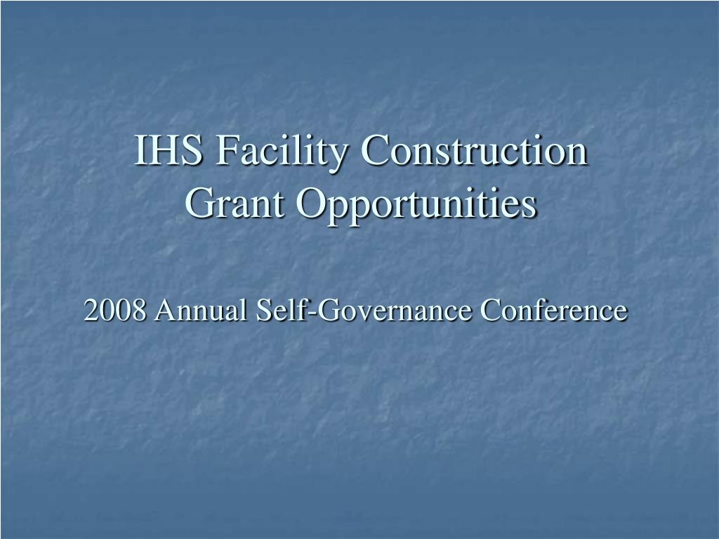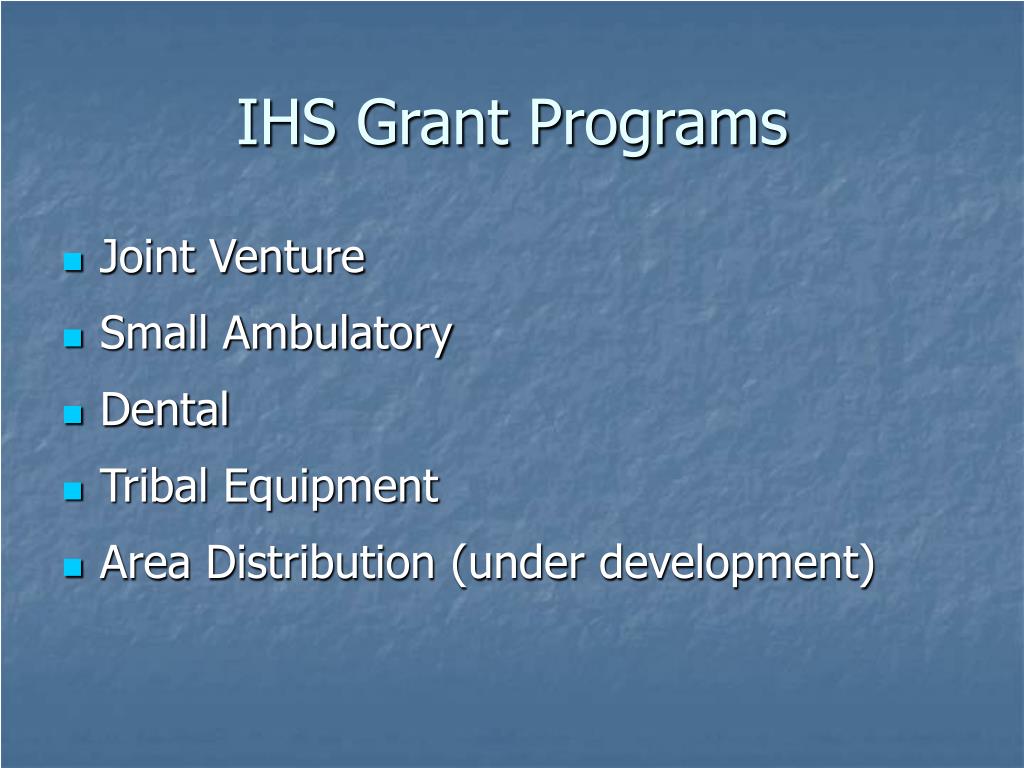 IHS Facility Construction Grant Opportunities. 2008 Annual Self-Governance Conference. IHS Grant Programs. Joint Venture Small Ambulatory Dental Tribal Equipment Area Distribution (under development). Joint Venture Grants. Eligibility – Any Federally Recognized AI/AN Tribe