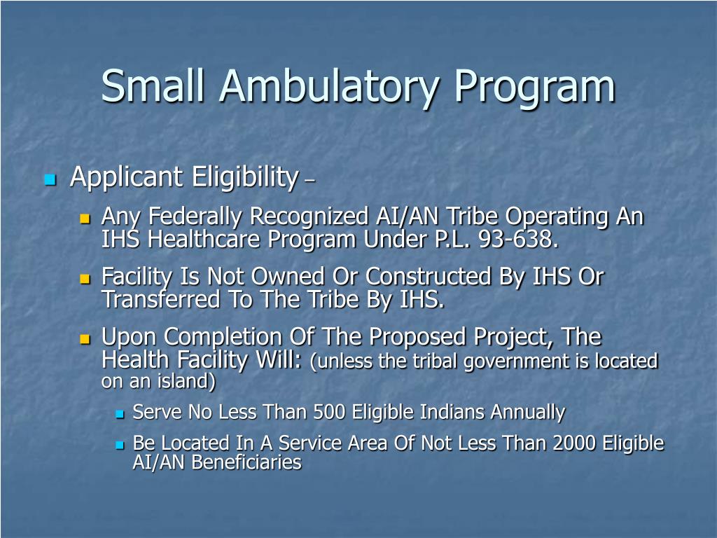 Small Ambulatory Program • Applicant Eligibility – • Any Federally Recognized AI/AN Tribe Operating An IHS Healthcare Program Under P.L. 93-638. • Facility Is Not Owned Or Constructed By IHS Or Transferred To The Tribe By IHS. • Upon Completion Of The Proposed Project, The Health Facility Will: (unless the tribal government is located on an island) • Serve No Less Than 500 Eligible Indians Annually • Be Located In A Service Area Of Not Less Than 2000 Eligible AI/AN Beneficiaries