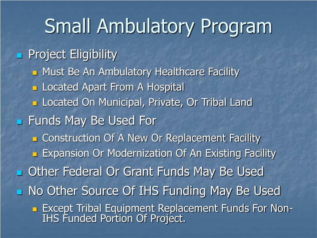 Small Ambulatory Program • Project Eligibility • Must Be An Ambulatory Healthcare Facility • Located Apart From A Hospital • Located On Municipal, Private, Or Tribal Land • Funds May Be Used For • Construction Of A New Or Replacement Facility • Expansion Or Modernization Of An Existing Facility • Other Federal Or Grant Funds May Be Used • No Other Source Of IHS Funding May Be Used • Except Tribal Equipment Replacement Funds For Non-IHS Funded Portion Of Project.