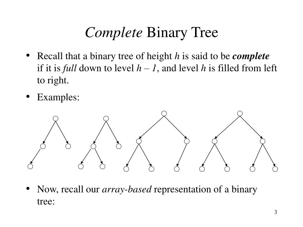 Complete Binary Tree • Recall that a binary tree of height h is said to be complete if it is full down to level h – 1, and level h is filled from left to right. • Examples: • Now, recall our array-based representation of a binary tree: